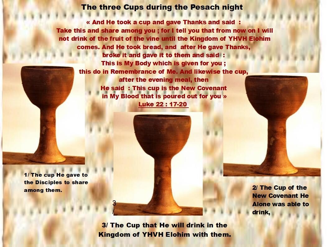 The Remembrance of Him would be done according to what happened that Night, according to the Words of The True Pesach Lamb of YHVH Elohim Who said, Luke 22 : 17-20 : « And He took a cup and gave Thanks and said : Take this and share among you ; for I tell you that from now on I will not drink of the fruit of the vine until the Kingdom of YHVH Elohim comes. And He took bread, and after He gave Thanks, broke it and gave it to them and said : This is My Body which is given for you ; this do in Remembrance of Me. And likewise the cup, after the evening meal, then He said : This cup is the New Covenant in My Blood that is poured out for you ».